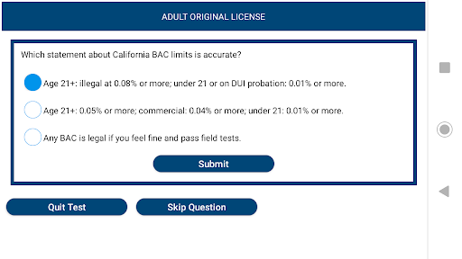 - Exam with questions based on the current California Driver’s Handbook, using the official interface (looks like on the real DMV driving test).